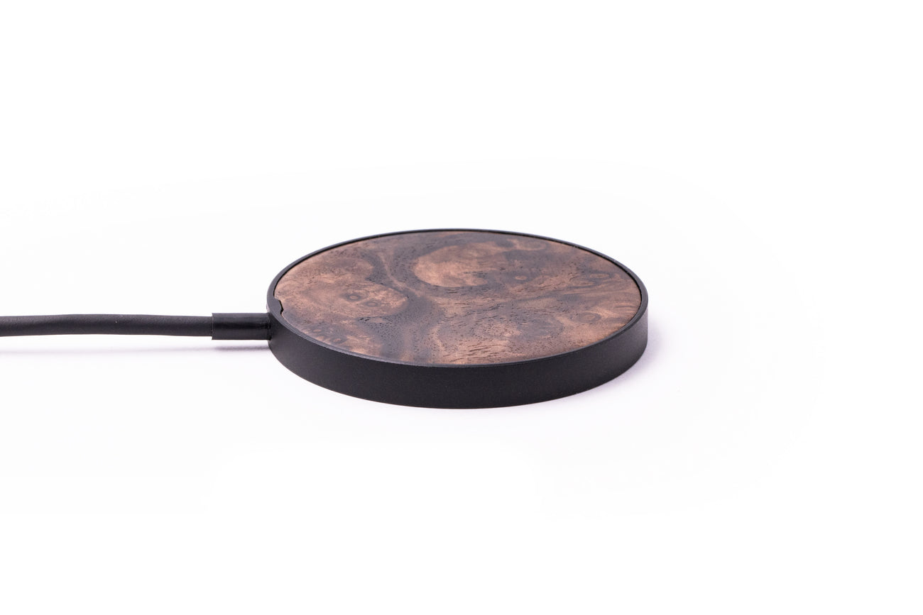 Perfectly simple, MagSafe compatible, USB-C, 1 of a kind Wireless Qi charger. CNC machined aluminum body. Every Wood+Resin inlay is unique and made at our shop in Elkhart, Indiana.