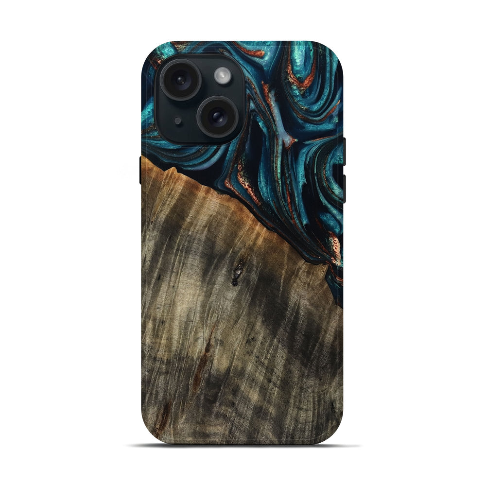 Our Live Edge cases are made from an amazing combination of stabilized wood burl and colored resin. Our stabilization process hardens the wood to protect against cracks and breaks. We do every step of the process at our shop in Northern Indiana. Perfectly fits the iPhone 15.