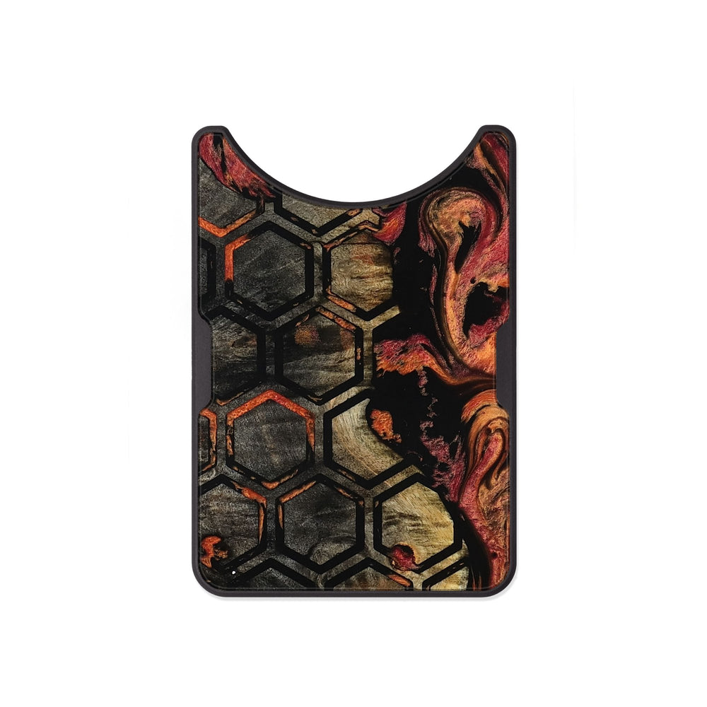 Aaden has warm tones of red and gold flowing around a pattern of hexagons. Its unique design blends natural wood with dynamic colors for an eye-catching look.