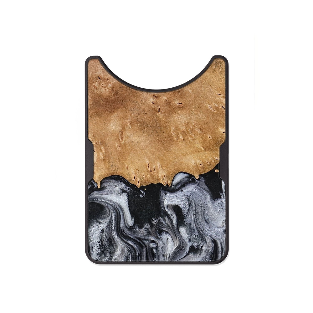 Aisha has a warm, golden maple wood surface with gentle curves and natural patterns. Below, it features smooth swirls of black and silver, creating a calming contrast.