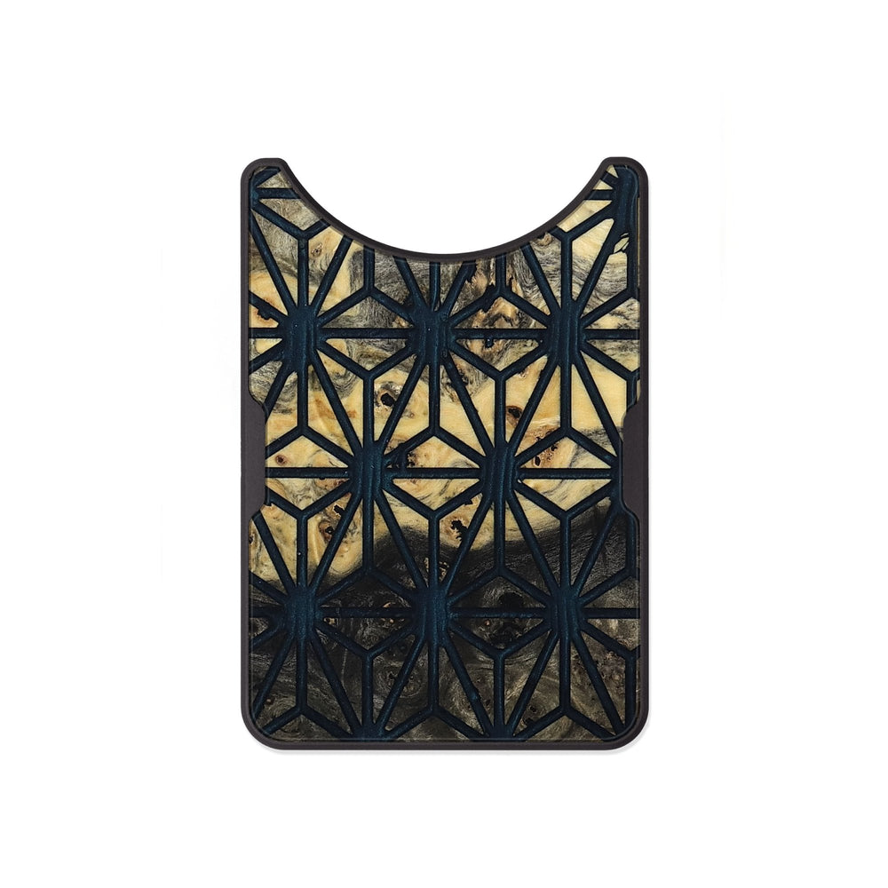 Amir has a striking geometric pattern that features repeated shapes in a rich, dark hue. The natural tones of the Buckeye wood blend beautifully beneath, creating a warm and inviting look.