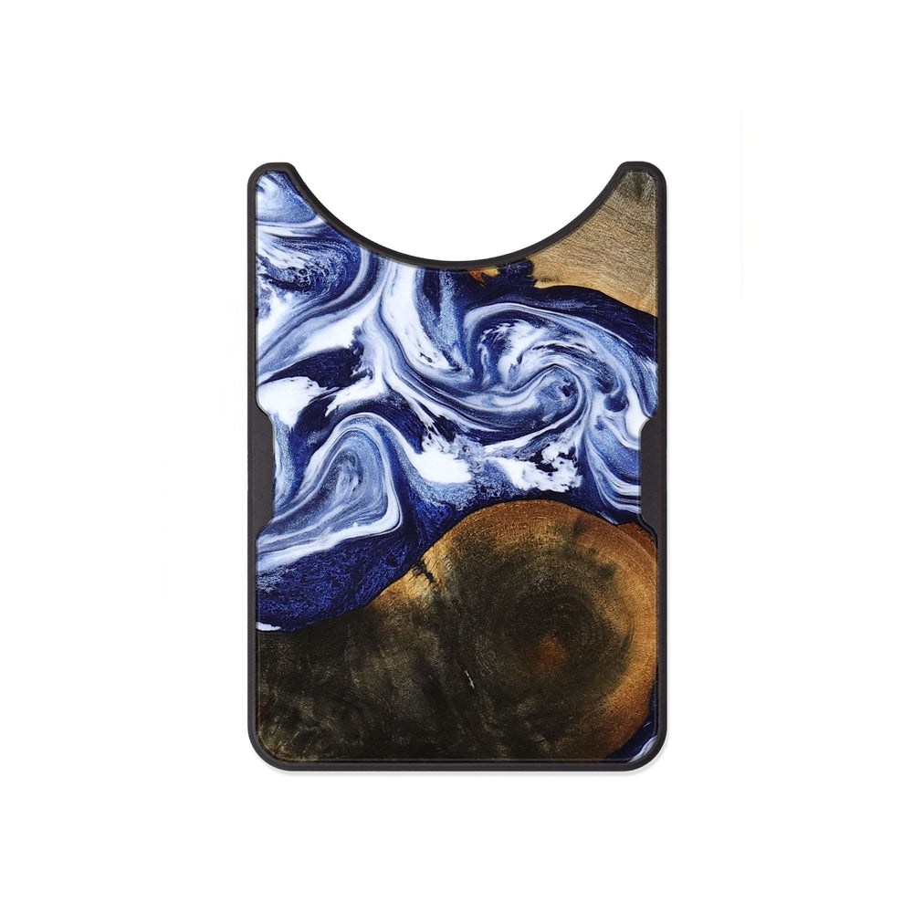 Amirah has a rich, warm Buckeye wood background with smooth, flowing patterns. The vibrant blue and white swirls create a beautiful contrast against the deep tones of the wood.