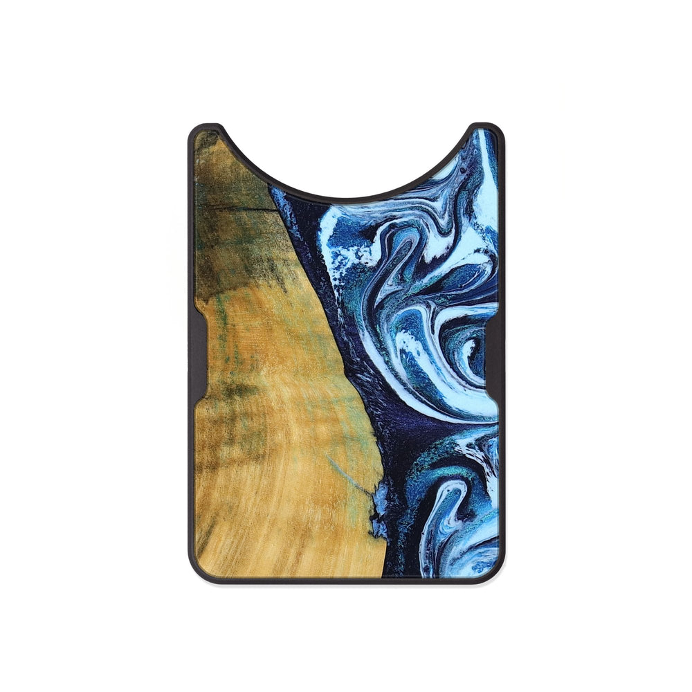 Amya has beautiful swirling patterns in shades of blue and white that contrast with the warm tones of the Buckeye wood. The smooth wood surface highlights the natural grain while the vibrant colors create a lively, flowing effect.