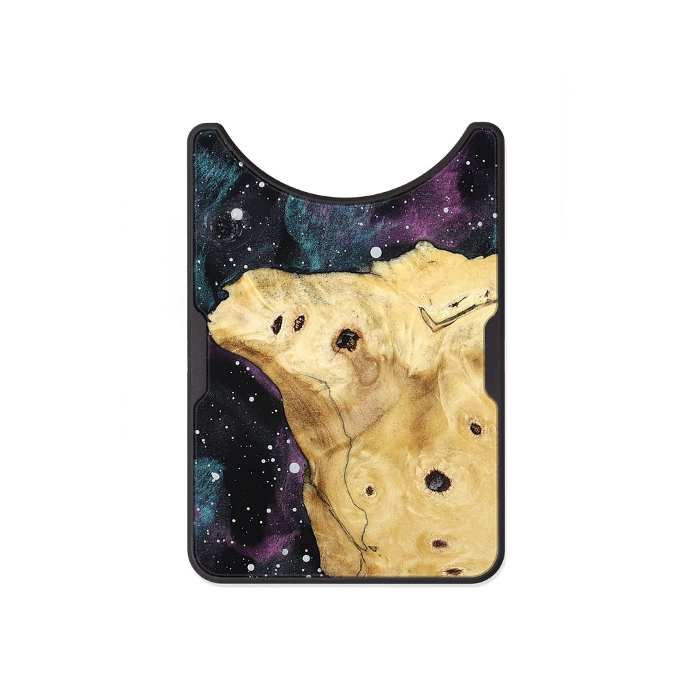 Arian is a piece of Buckeye wood with a warm, natural hue and unique patterns of small holes. Its smooth surface contrasts beautifully with the colorful, starry background, creating a sense of depth and wonder.