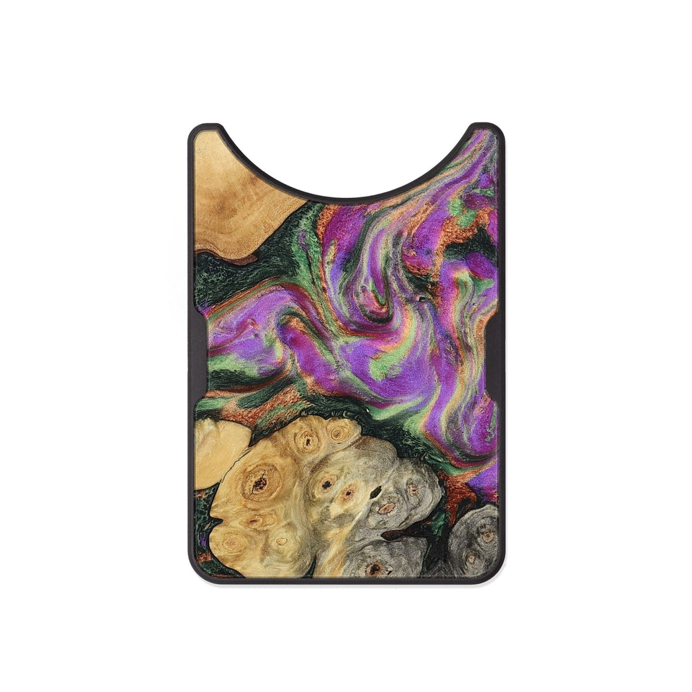 Aydan has a swirling mix of vibrant purple and green colors, creating a lively movement across the surface. Its textures showcase natural wood patterns, adding depth and richness to the artwork.