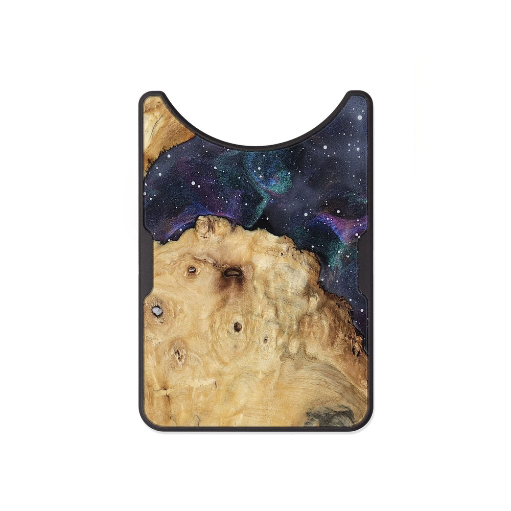 Cassian has a warm, natural texture with beautiful swirls and unique holes. The patterns in the wood create a stunning contrast against a deep, starry background.