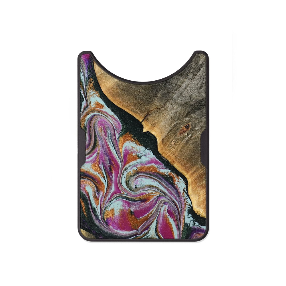 Frida has flowing swirls of pink and blue that dance along the edge of the rich brown wood. The patterns create a vibrant contrast against the natural texture, adding a lively touch to the piece.