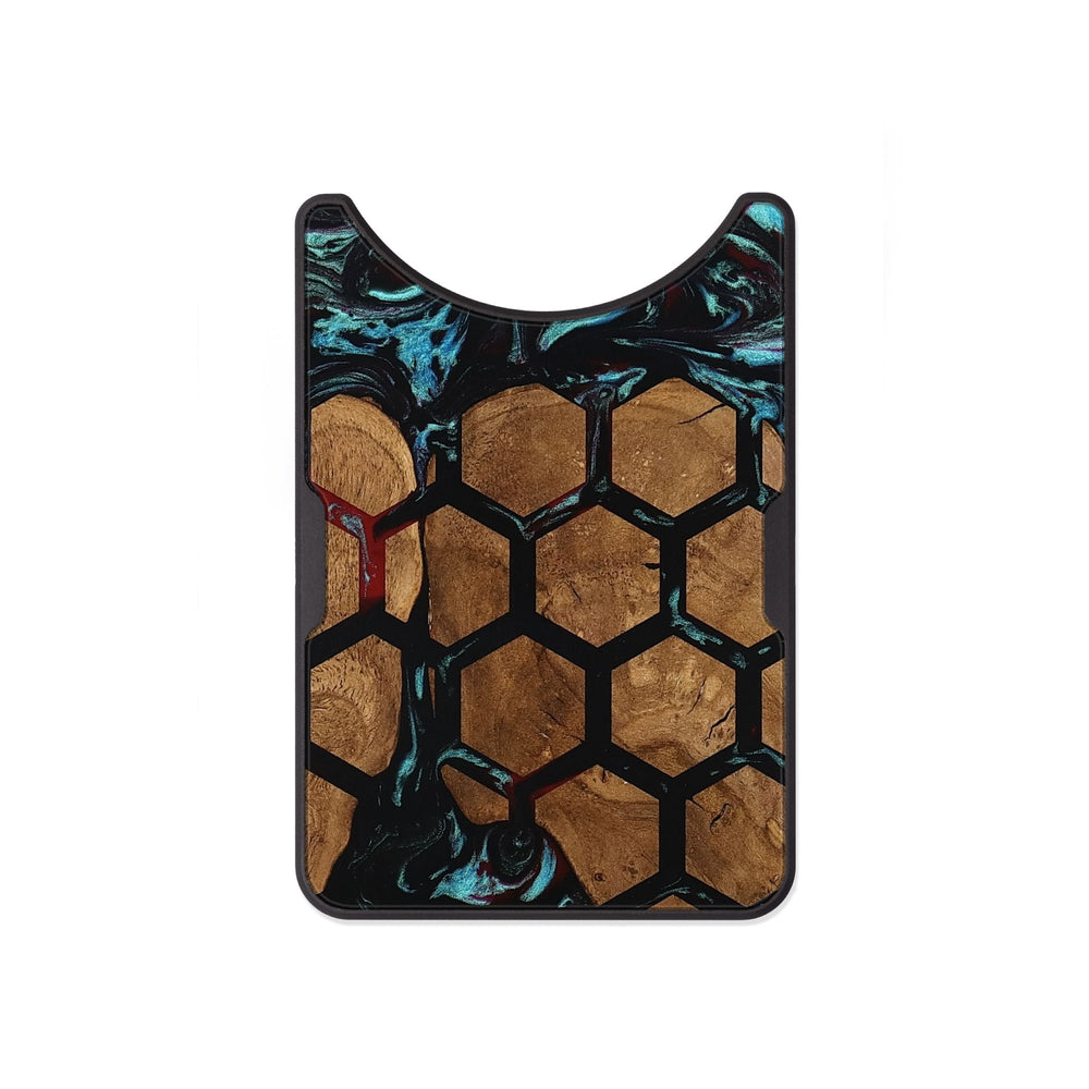 Hakeem features a beautiful pattern of hexagons made from warm maple wood, creating a natural and inviting look. The soft, earthy tones of the wood contrast nicely with the swirls of dark colors above, adding depth to the piece.