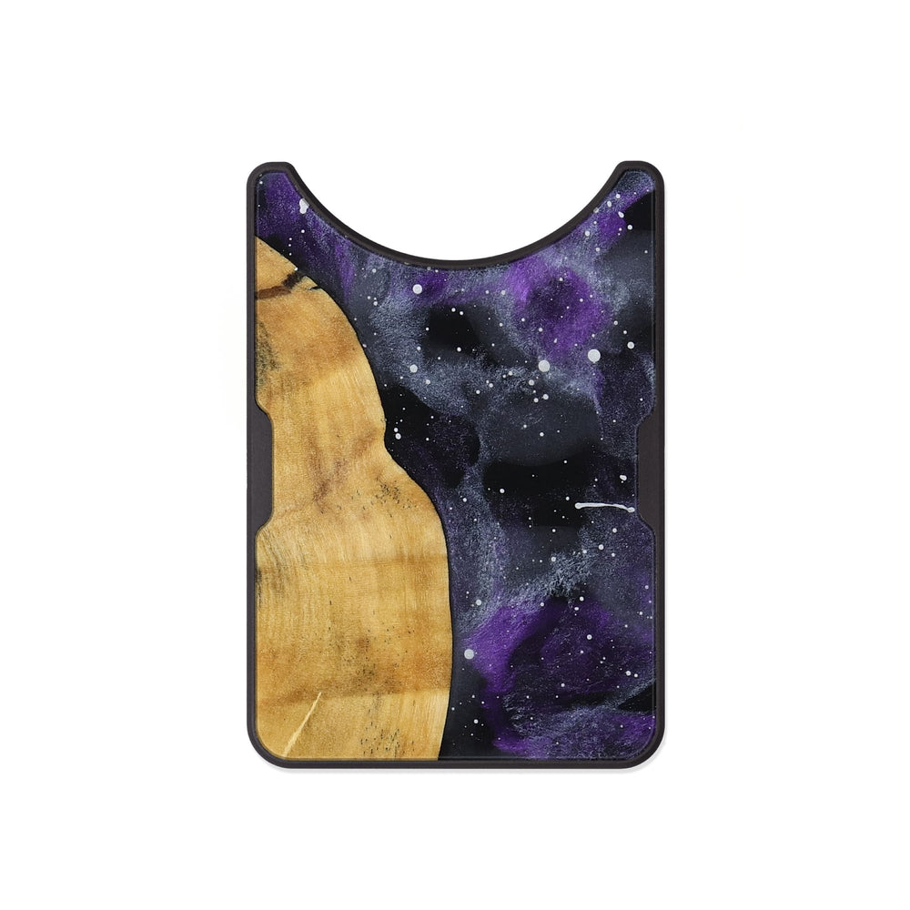 Isaias has a warm, natural wood grain that contrasts beautifully with a deep, swirling purple background. The art combines organic texture with vibrant colors, creating a serene and inviting look.