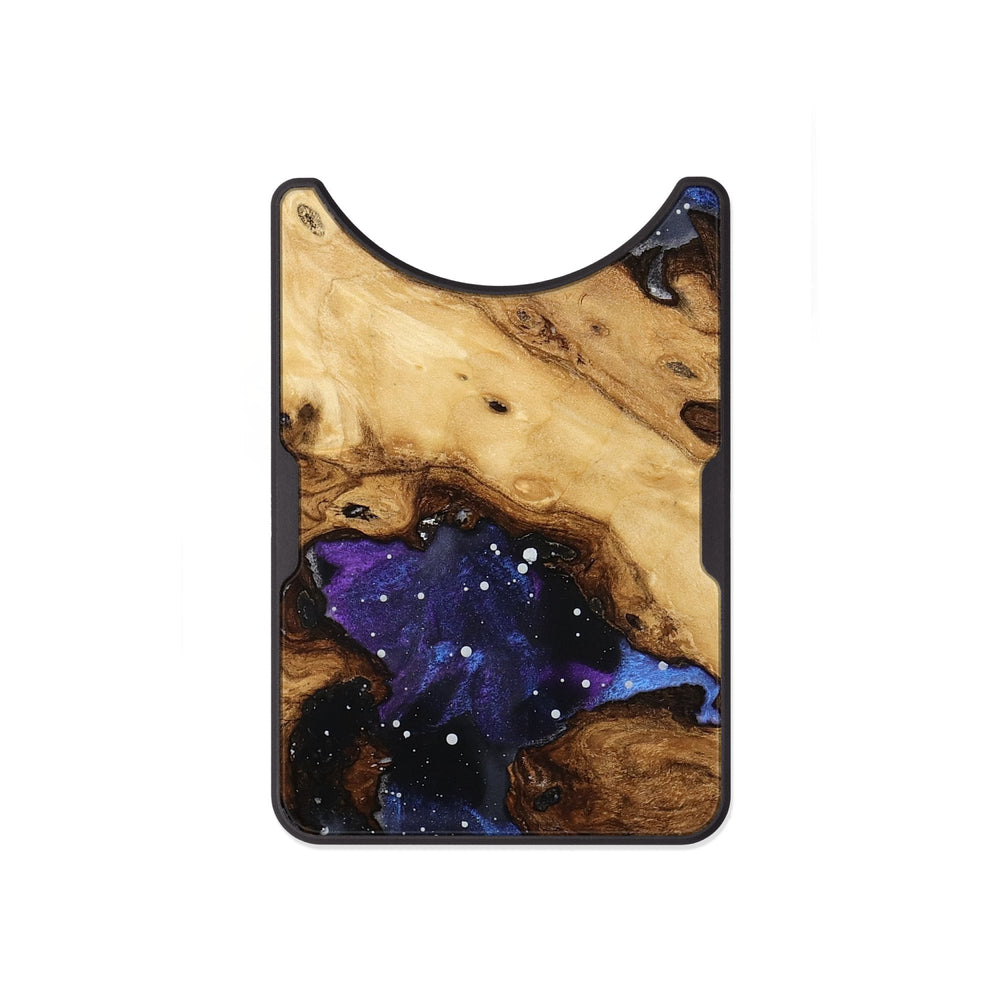Isiah has a warm, natural wood grain with dark, swirled patterns that create a cosmic feel. The deep blues and purples in the background enhance its unique design, making it visually striking.