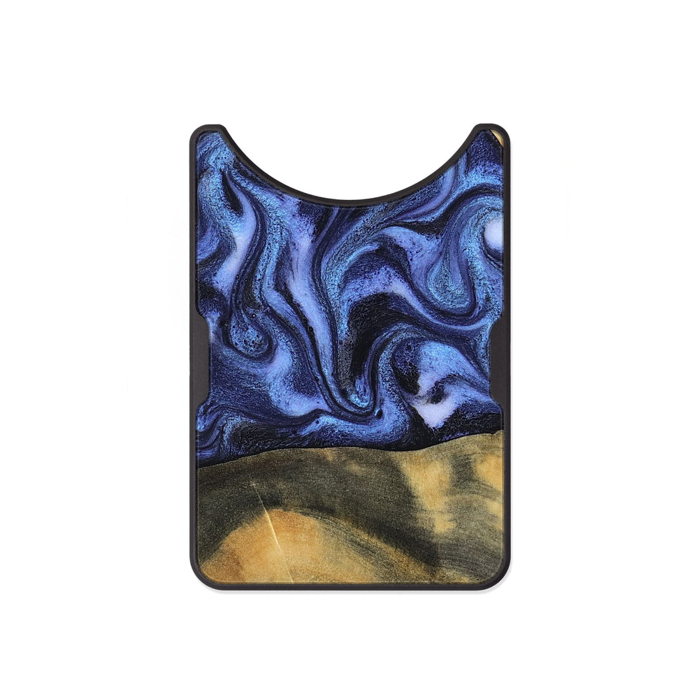Izaiah features a mix of soft blues and deep purples swirling in a smooth pattern. The warm, natural tones of the Buckeye wood create a lovely contrast, enhancing its unique beauty.