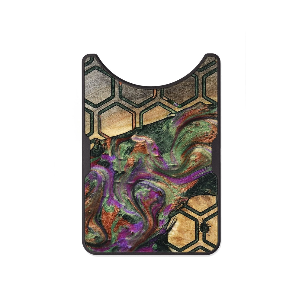 Jaelyn has a rich, colorful swirl pattern that blends vibrant greens, purples, and golds. The background features a striking honeycomb design that adds a unique texture to the piece.