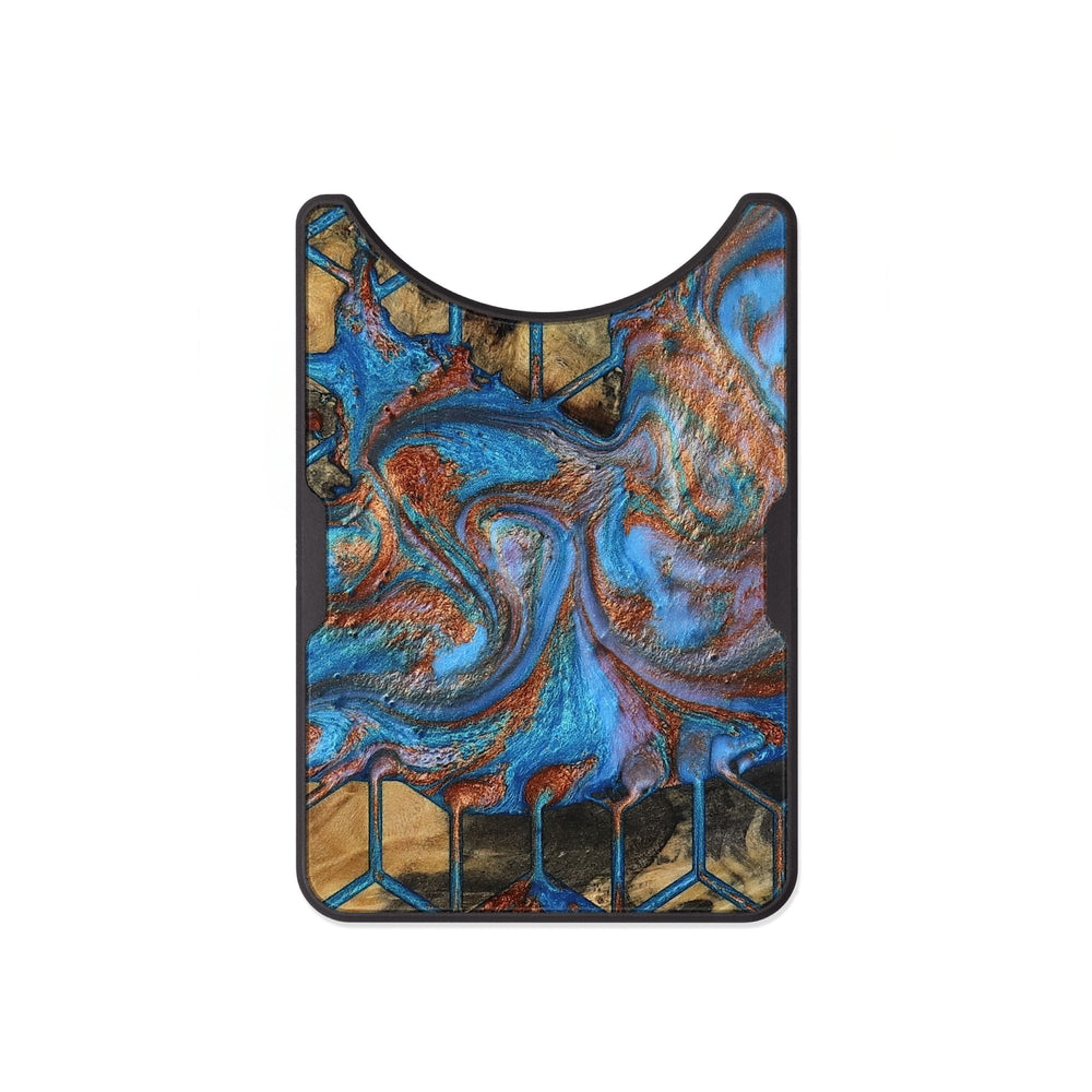 Jarred has beautiful swirls of blue and copper colors dancing across a background of warm wood. The hexagonal pattern adds a unique touch, highlighting the vibrant designs.