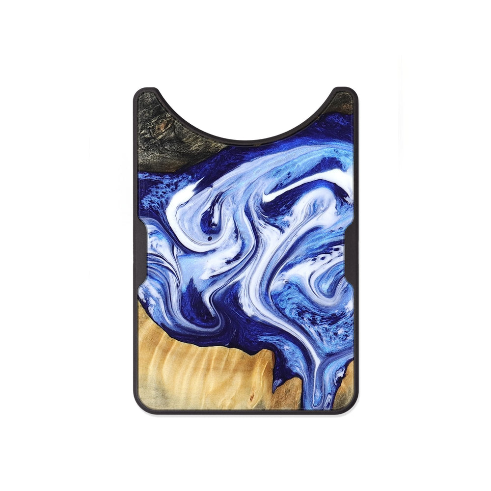 Ola has a smooth, natural grain that showcases warm tones of browns and cream. The swirling blue and white patterns add a striking contrast and a sense of movement to the wood.
