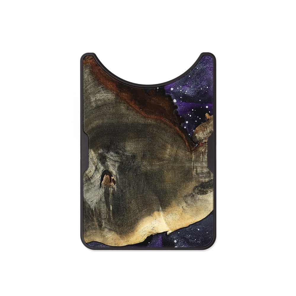 Perley has a unique blend of natural wood grain with rich, warm tones. The deep purple background adds a striking contrast, creating a cosmic feel.