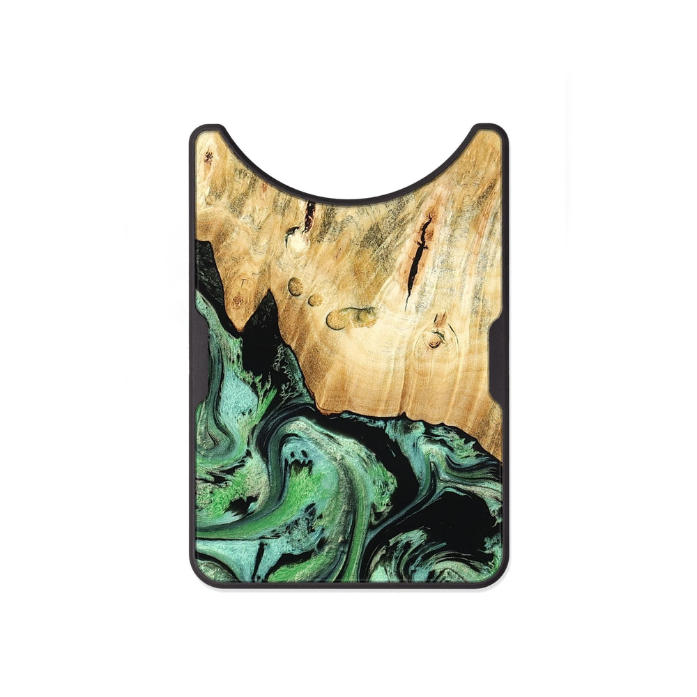 Pierce has a smooth, light surface with beautiful patterns and tiny dark spots. The flowing green and black shapes at the bottom create a striking contrast with the wood above.