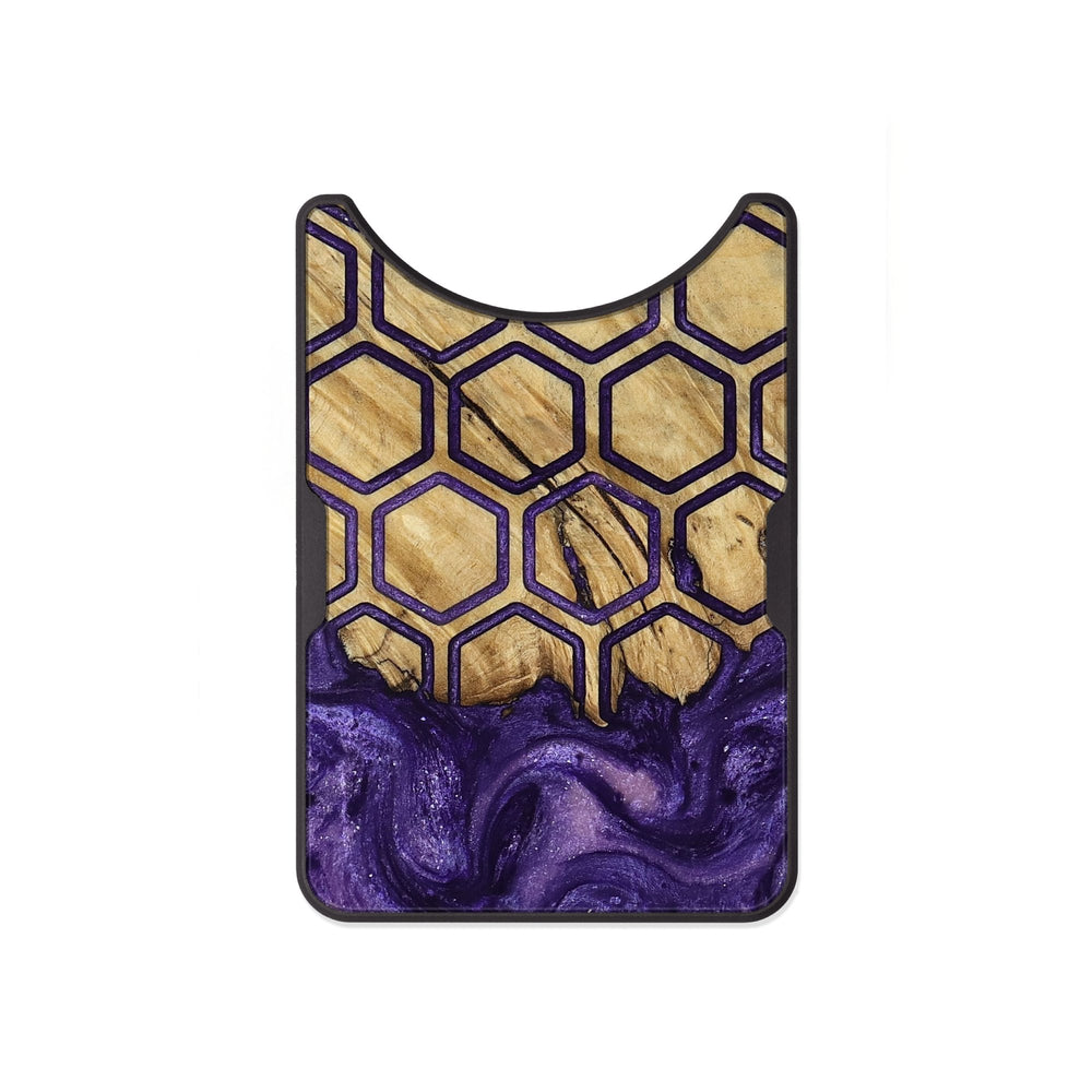 Regan has a unique pattern with honeycomb shapes arranged over a warm, golden wood background. The deep purple swirls at the bottom add a striking contrast, creating a balanced yet intriguing look.