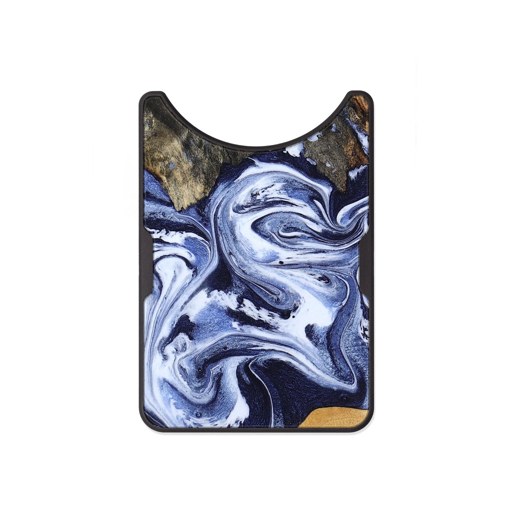 Renada features beautiful swirls of deep blue and white, creating a calm, flowing design. The warm tones of the Buckeye wood add a cozy touch to the overall artwork.