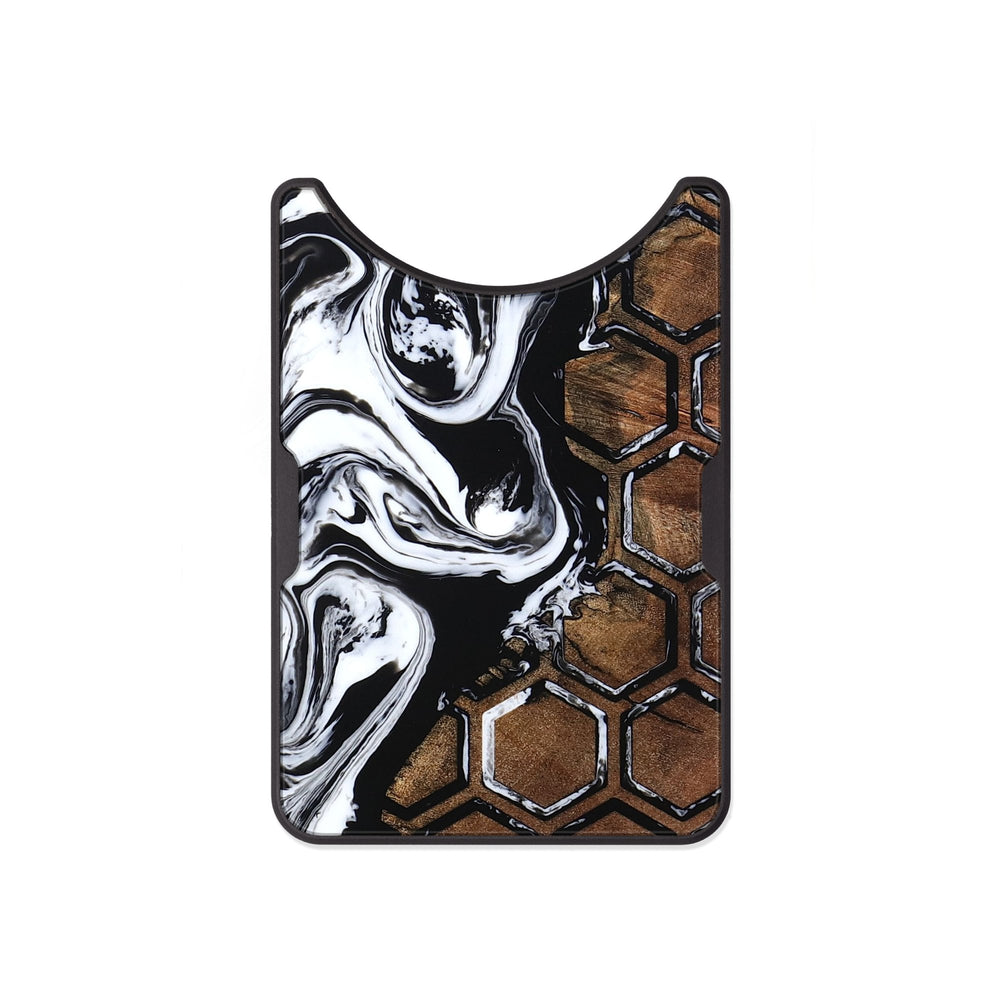Rollin has a warm, rich maple wood surface with a smooth texture. The artwork features an eye-catching pattern of hexagons that contrasts beautifully with the flowing black and white details.