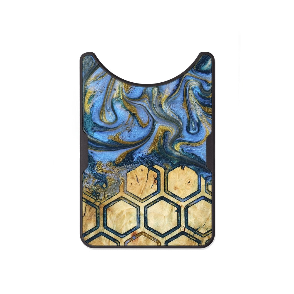 Shari has a beautiful swirl of blue and gold tones that dance across its surface. It features a neat pattern of hexagons, adding a playful touch to the warm wood grain.