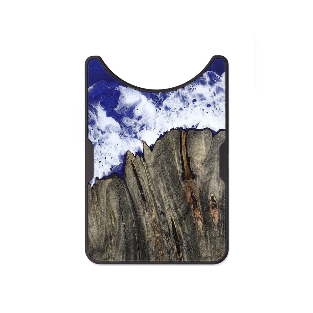 Staci has beautiful, dark wood with a smooth texture and unique grain patterns. It features a striking contrast with bold, deep blue and white swirls at the top, adding a vivid touch.