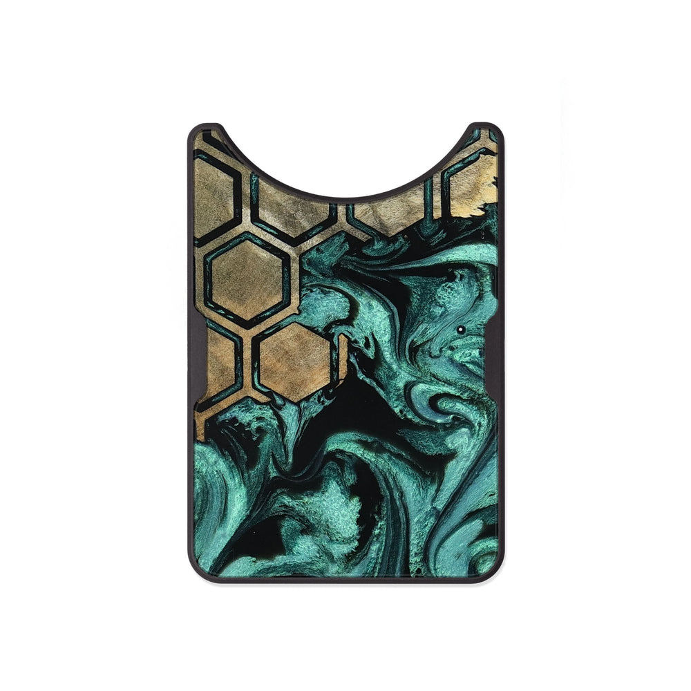 Zariyah features a mix of deep, swirling greens and blacks, creating a calming, fluid effect. It has a pattern of hexagons that adds a unique geometric touch to the natural wood design.