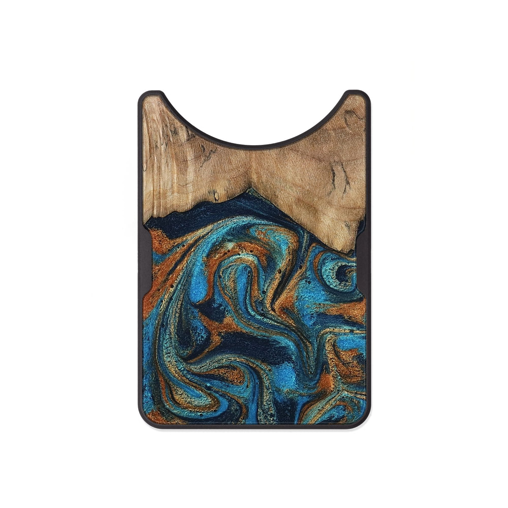 Brea has a warm, rich maple wood finish that highlights its natural grain. It features a flowing pattern of swirling blue and orange colors, creating a vibrant contrast with the wood.