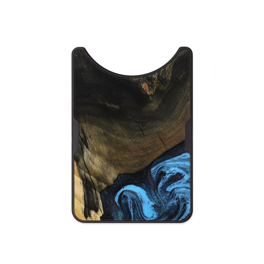 Clora has beautiful patterns in the wood that show rich golden and dark tones. The swirls of blue add a lively contrast, creating a dynamic visual effect.