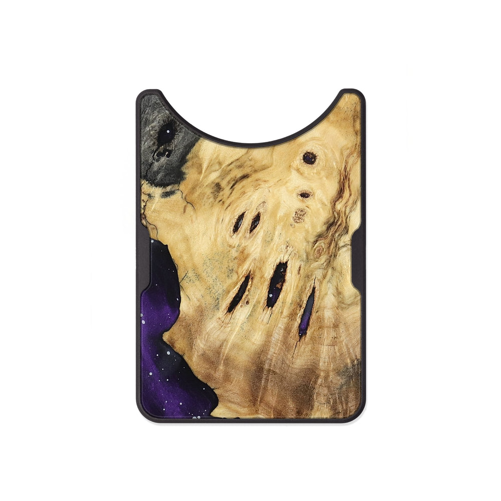 Daxton has a unique blend of light and dark wood, showcasing natural patterns and knots. The smooth, organic shapes create a beautiful contrast against a rich purple background.