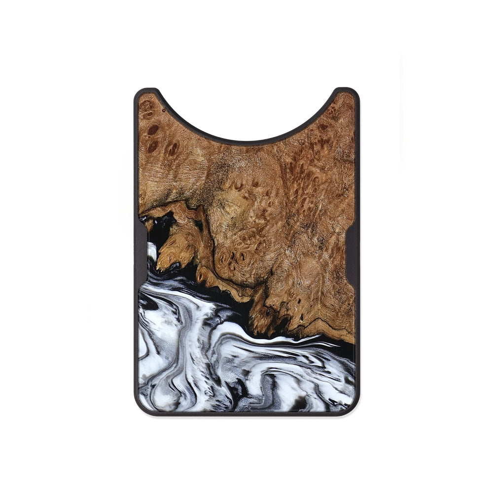 Debi has a warm, rich brown tone with unique knots and patterns that catch the eye. The smooth surface contrasts beautifully with swirling black and white shapes, creating an interesting visual flow.