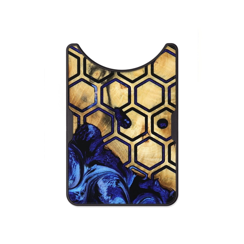 Emilie has a warm wood finish with beautiful swirls of deep blue and gold. The pattern of hexagons creates a striking contrast against the flowing colors, giving it a unique and lively look.