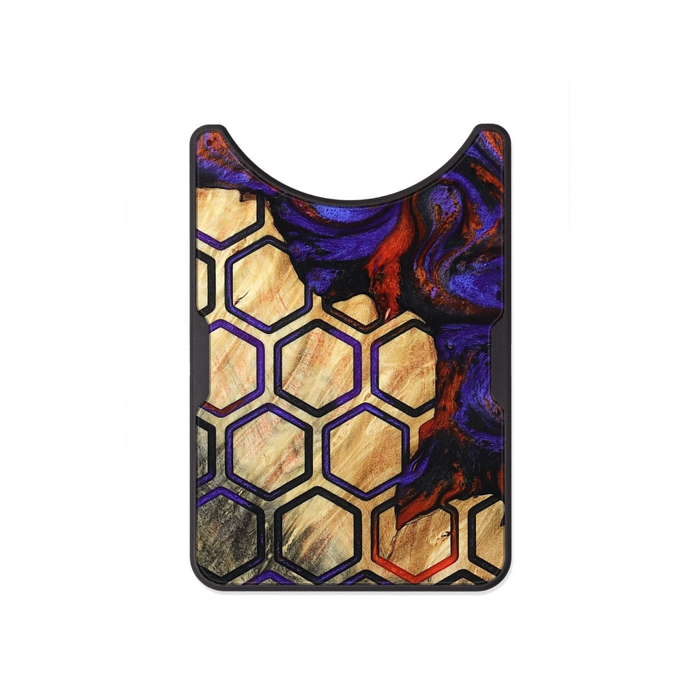Jeanie has a blend of rich, swirling colors in purple and orange, creating a dynamic flow. The hexagonal pattern on one side adds a striking contrast to the vibrant wood tones.