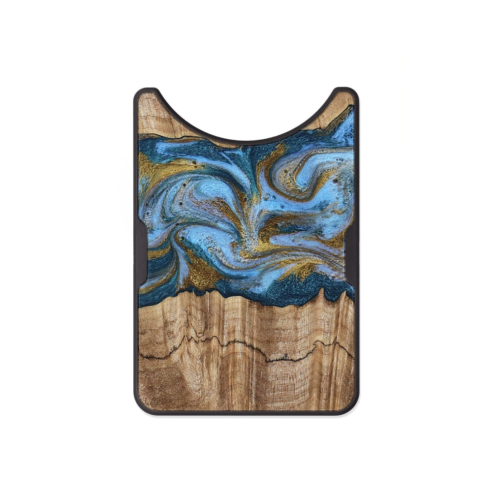 Jolene has beautiful, swirling patterns in blue and gold that stand out against the warm maple wood. The grain of the wood adds a rich texture, making it feel both natural and vibrant.