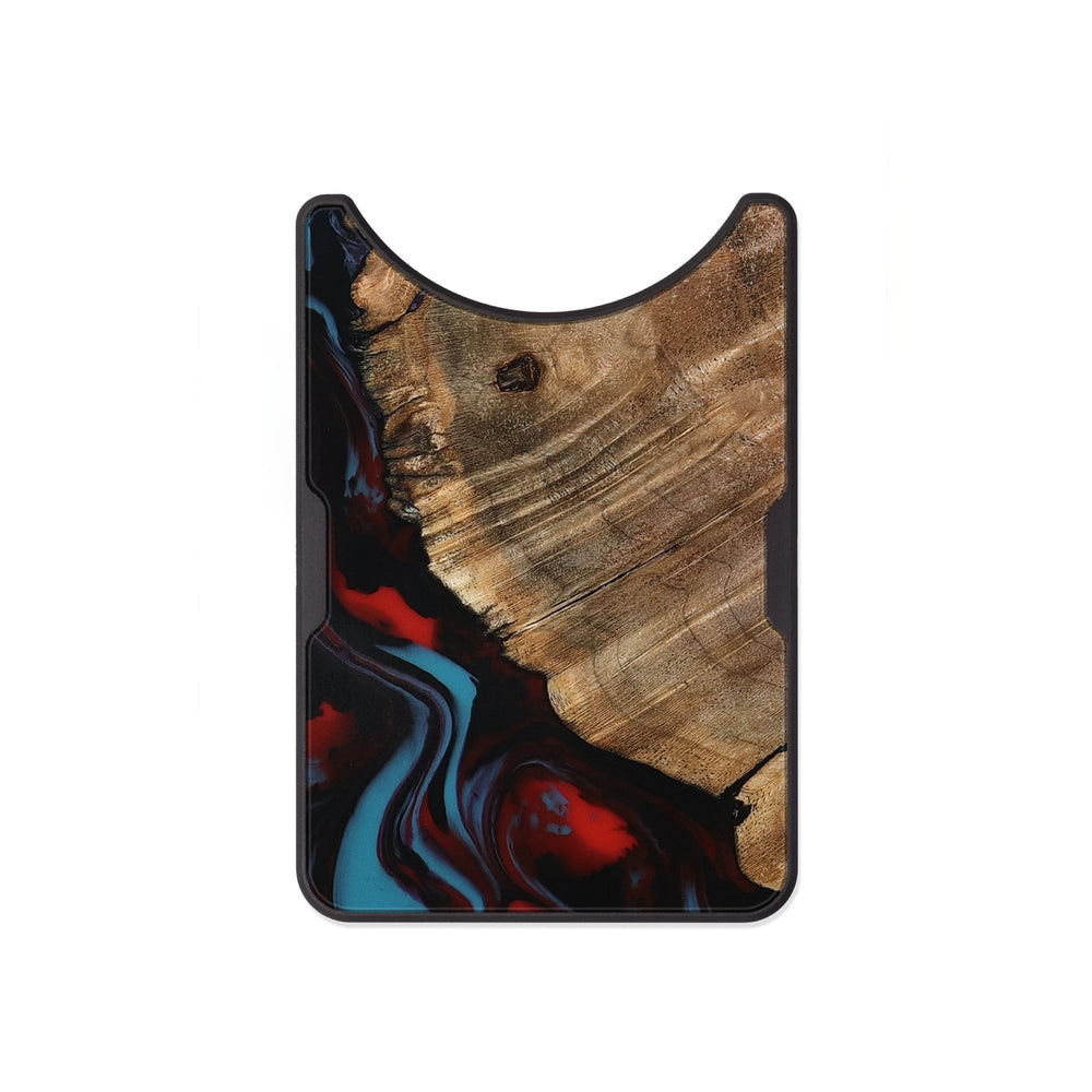 Kassie has a warm, natural finish of Maple wood with beautiful grain patterns. It features a striking mix of dark reds and blues swirling around it, adding a vibrant touch.