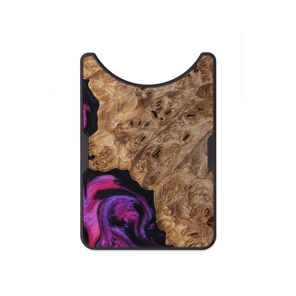 Leticia has a beautiful, natural pattern in its Maple wood, showcasing rich, swirling grains. The warm tones of the wood contrast nicely with vibrant hues of purple and black around it.