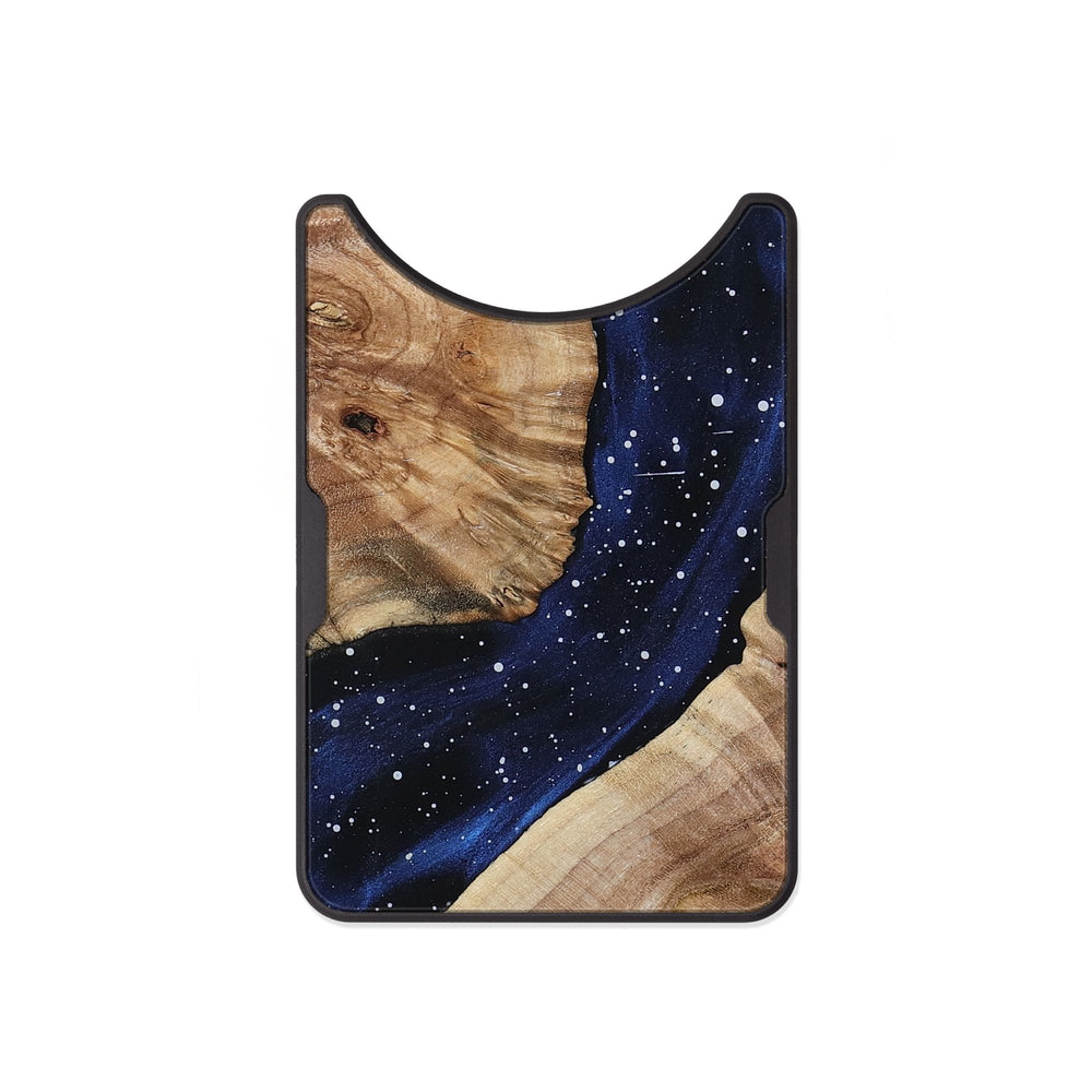 Mamie has beautiful maple wood with interesting grain patterns. The warm tones of the wood contrast nicely with the deep blue and white elements, creating a serene, night-sky feel.