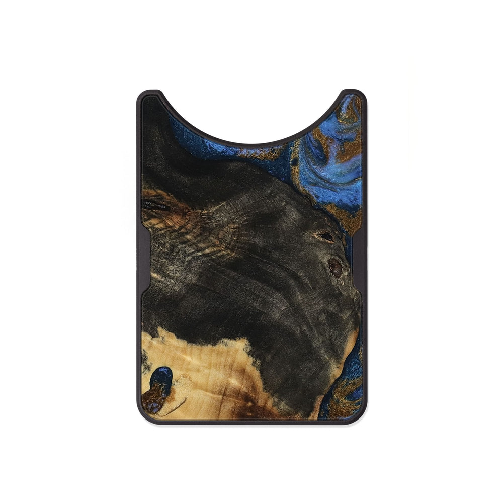 Mittie has beautiful, swirling patterns in rich blue, gold, and brown tones. The wood features unique textures and shapes that highlight its natural beauty.