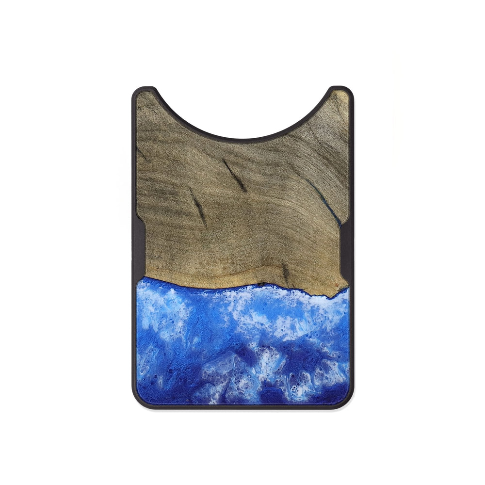Sadie is a piece of Buckeye wood with rich, natural patterns and warm tones. It has a smooth, curved edge that contrasts beautifully with a vibrant blue area below.