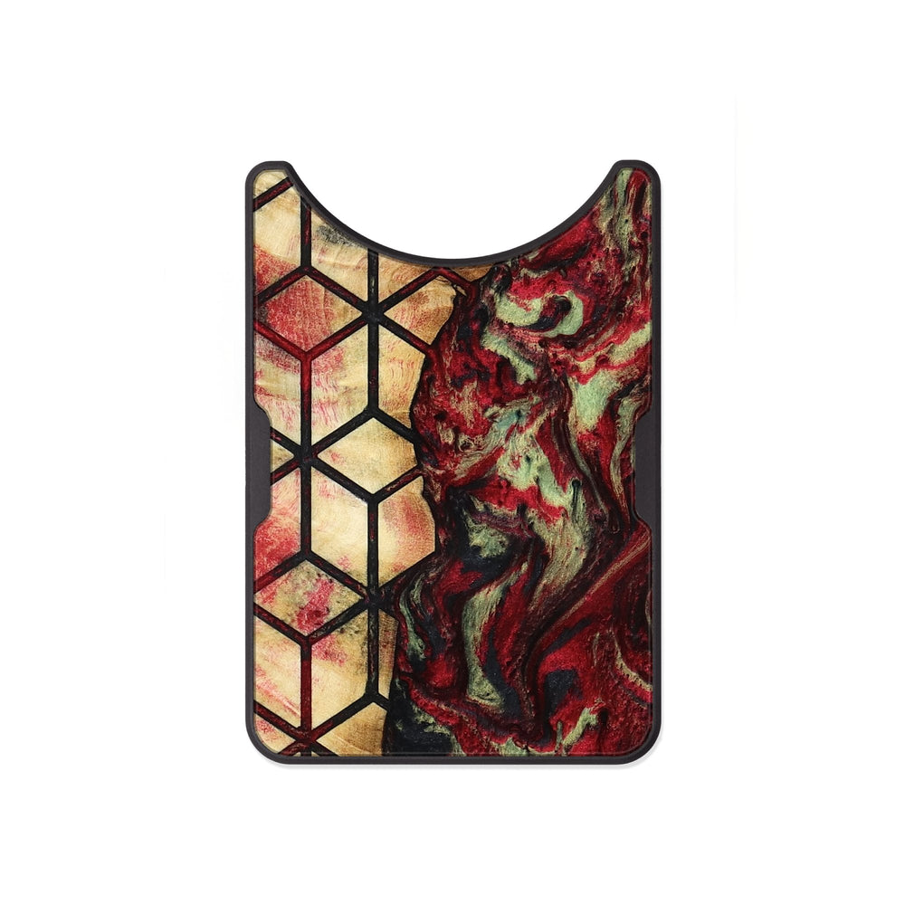 Watson has a striking pattern of hexagons that create a unique contrast with swirling red and green tones. The smooth wood surface highlights its natural beauty and rich color variations.