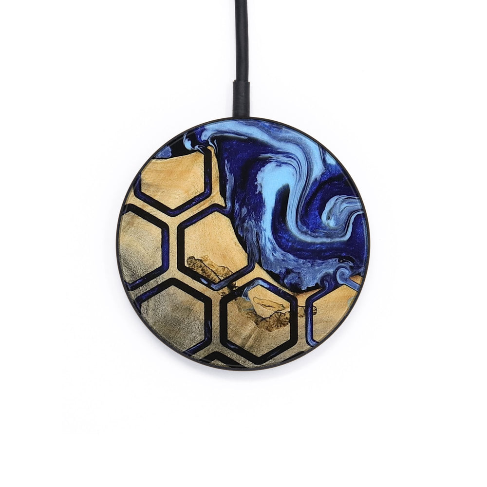 Amiya has warm Buckeye wood with a honeycomb pattern that adds a touch of texture. The swirls of blue and white create a calming contrast against the natural grain, making it visually striking.