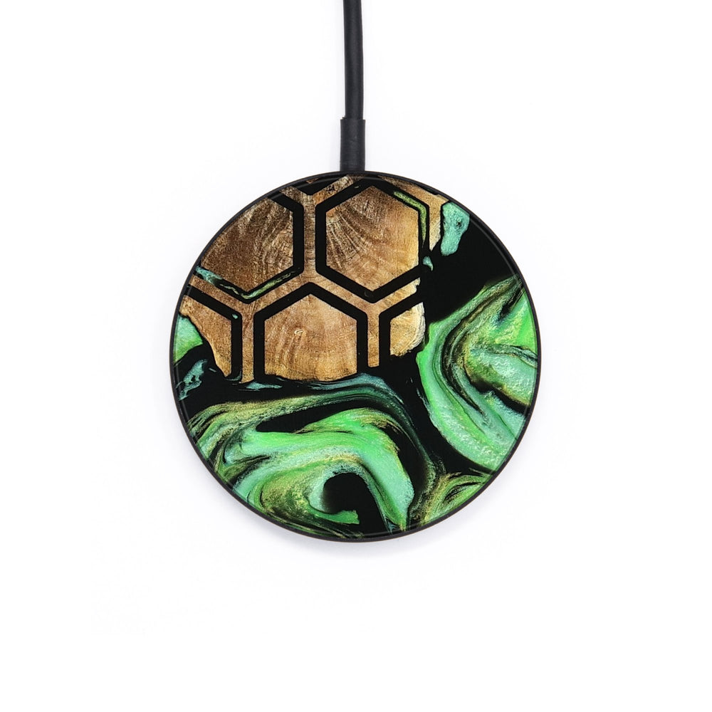 Brayan features a striking honeycomb pattern that contrasts beautifully with swirling green and black designs. The warm tones of the Buckeye wood add a rich depth to the overall artwork.