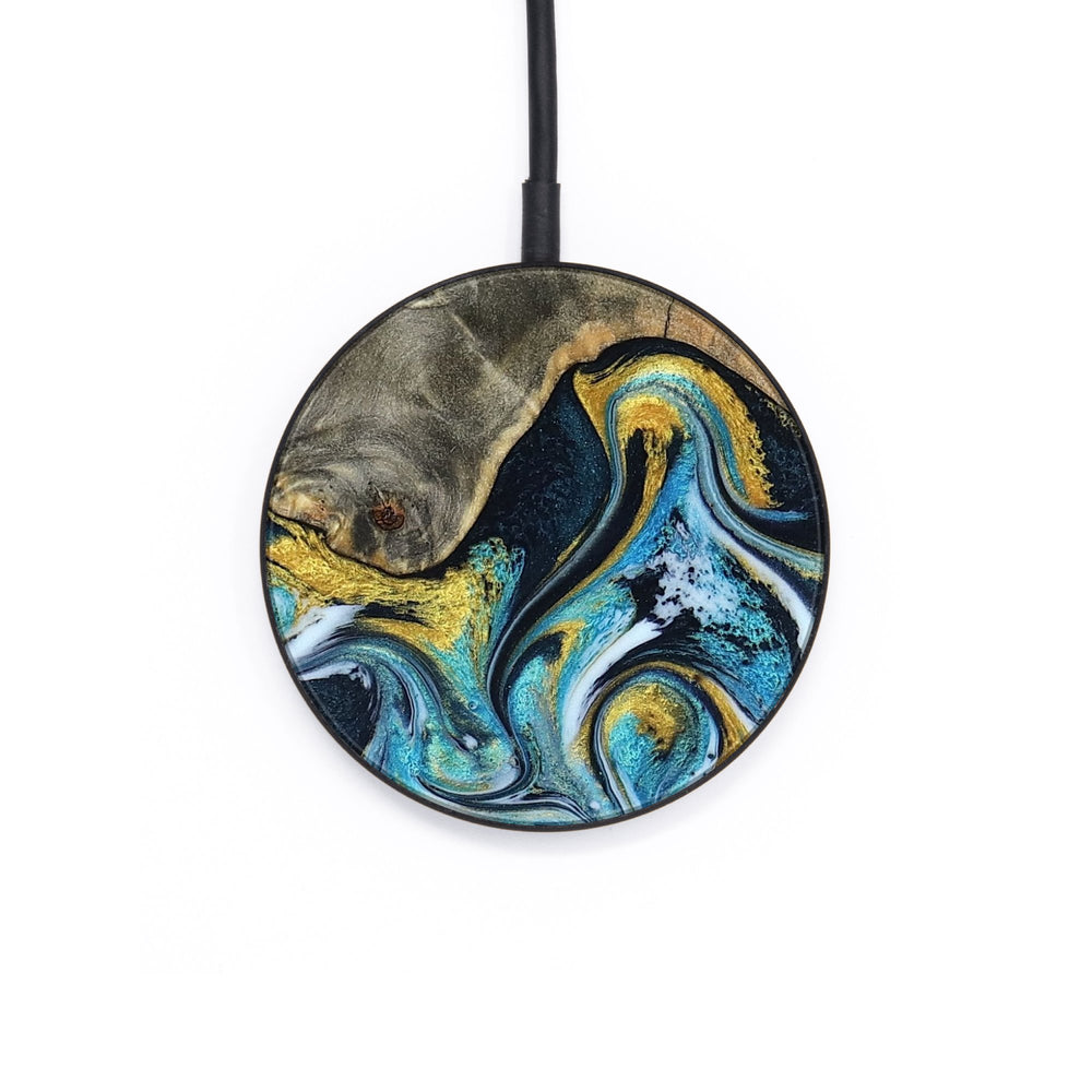 Perfectly simple, MagSafe compatible, USB-C, 1 of a kind Wireless Qi charger. CNC machined aluminum body. Every Wood+Resin inlay is unique and made at our shop in Elkhart, Indiana.