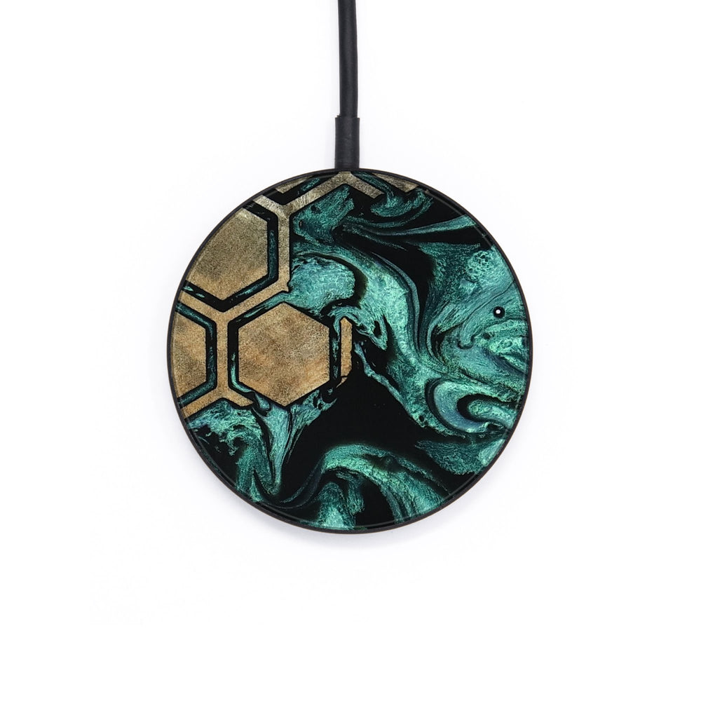 Zariyah features a mix of deep, swirling greens and blacks, creating a calming, fluid effect. It has a pattern of hexagons that adds a unique geometric touch to the natural wood design.