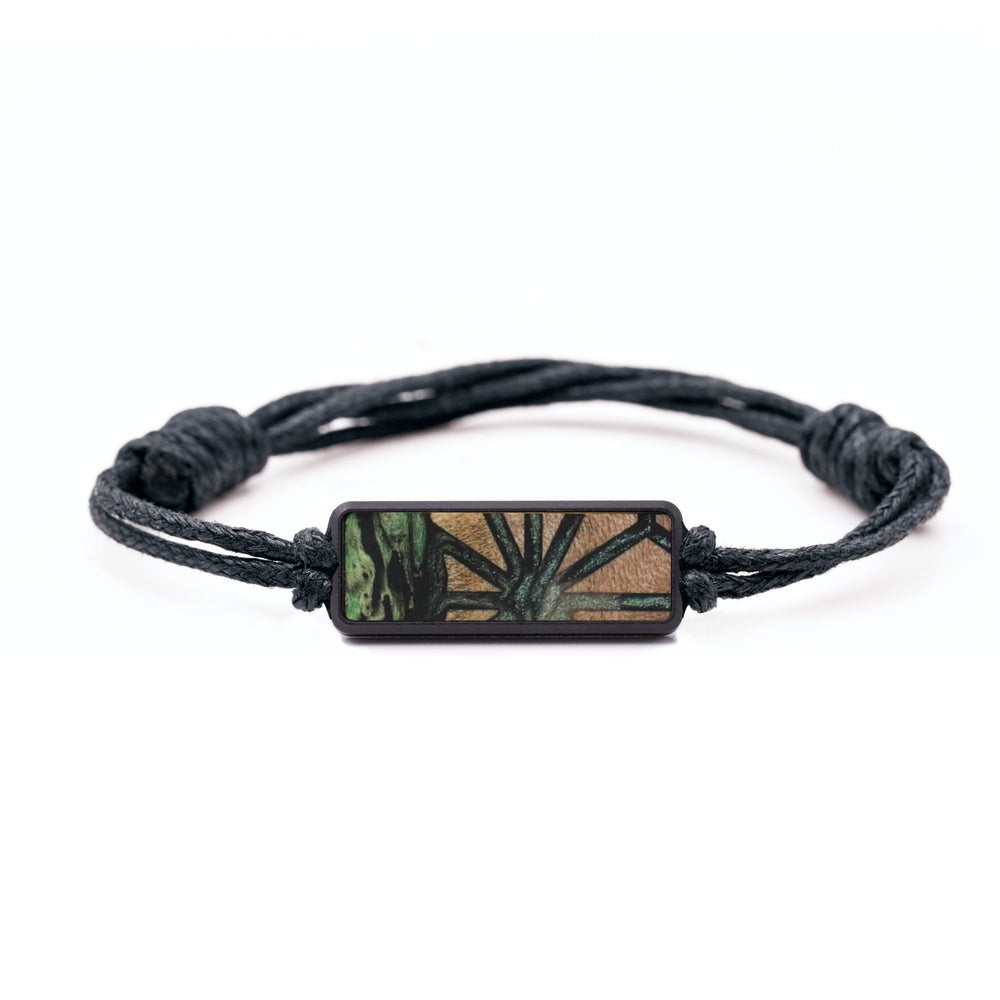 The housing is machined from a solid piece of black anodized aluminum. The cord is tied with adjustable knots to make it easy to fit to your wrist. We then inlay a small piece of our Wood+Resin material in the front of the housing. Everything fits together perfectly to make a simple, unique bracelet.