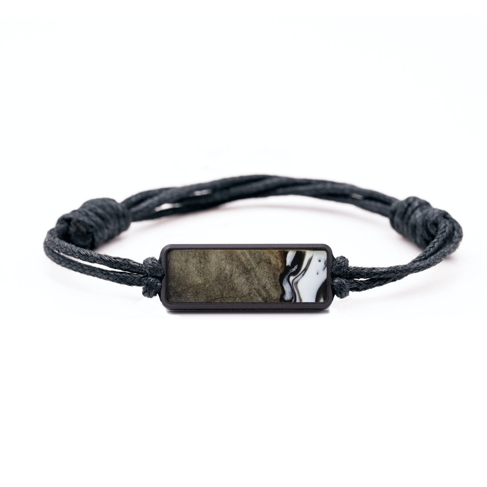 The housing is machined from a solid piece of black anodized aluminum. The cord is tied with adjustable knots to make it easy to fit to your wrist. We then inlay a small piece of our Wood+Resin material in the front of the housing. Everything fits together perfectly to make a simple, unique bracelet.