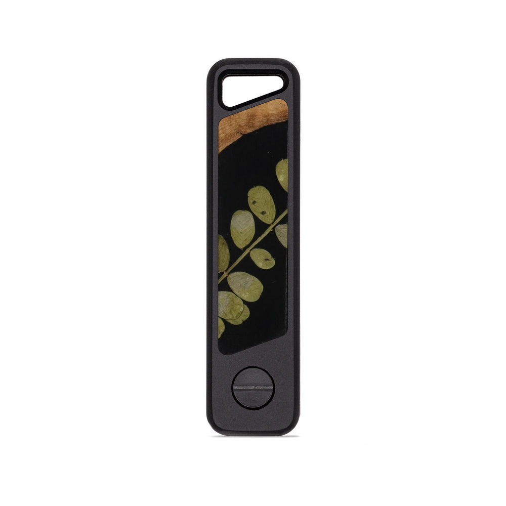 A sleek and rugged keyholder machined from a solid block of aluminum with unique inlay. It's lightweight, ultra-durable, and built to keep your keys organized without the jingle. Holds up to 4 keys in a compact, no-bulk design. Just unscrew, slide your keys on, and tighten it back up. Removable clip on reverse side.