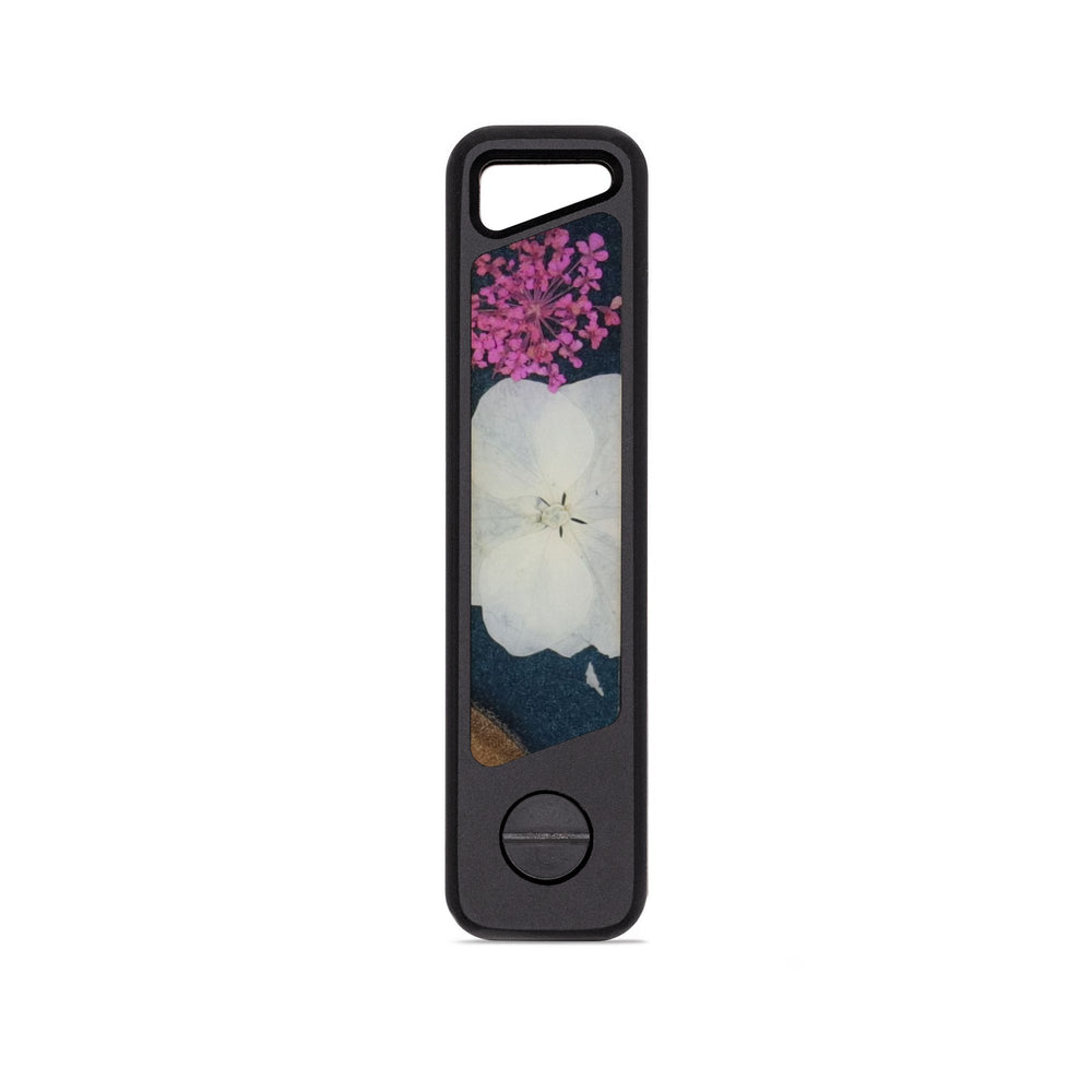 A sleek and rugged keyholder machined from a solid block of aluminum with unique inlay. It's lightweight, ultra-durable, and built to keep your keys organized without the jingle. Holds up to 6 keys in a compact, no-bulk design. Just unscrew, slide your keys on, and tighten it back up. Removable clip on reverse side.