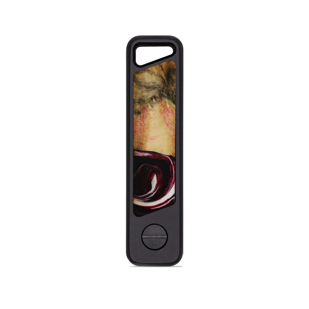 A sleek and rugged keyholder machined from a solid block of aluminum with unique inlay. It's lightweight, ultra-durable, and built to keep your keys organized without the jingle. Holds up to 4 keys in a compact, no-bulk design. Just unscrew, slide your keys on, and tighten it back up. Removable clip on reverse side.