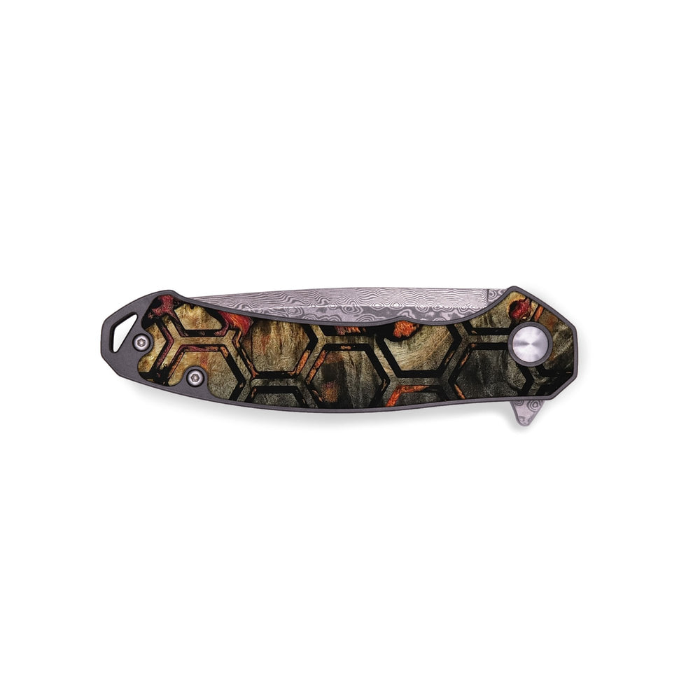 Experience the perfect blend of form and function with our durable folding pocket knife, featuring a lightweight titanium handle. The Damascus stainless steel blade is complemented by a unique wood burl and resin inlay. Imported blade and handle.