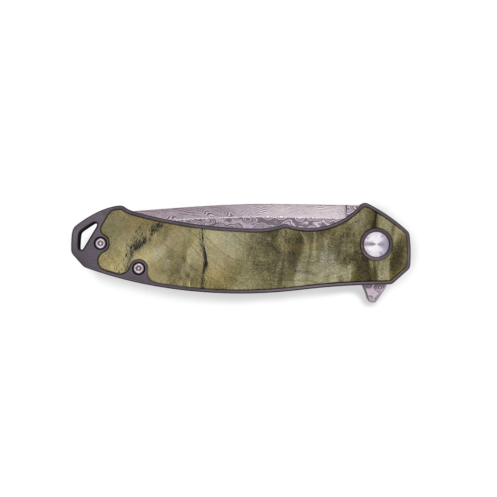 Experience the perfect blend of form and function with our durable folding pocket knife, featuring a lightweight titanium handle. The Damascus stainless steel blade is complemented by a unique wood burl and resin inlay. Imported blade and handle.